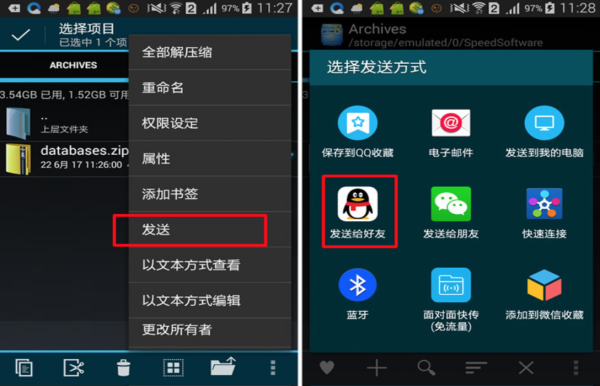 5、然后通过“发送”功能,将该压缩文件通过QQ或其它方式将其发送到电脑上即可。如果手机上和