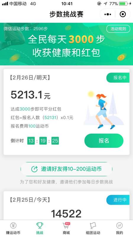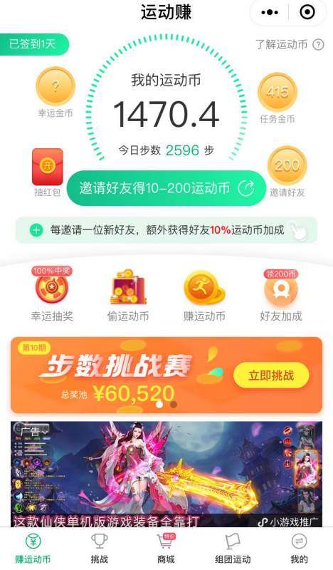 每天可以花费100个运动币报名参加挑战,首次1元可以提现