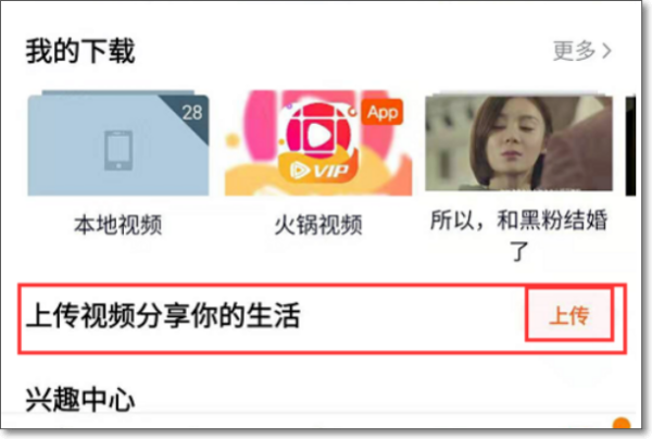 2、在我的里面找到上传视频分享你的生活,点击上传。