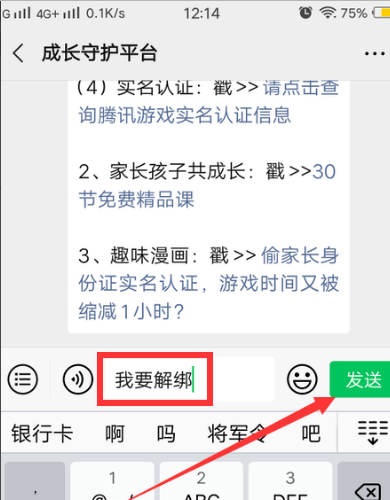 二、在成长守护平台里,输入我要解绑,然后点击发送。