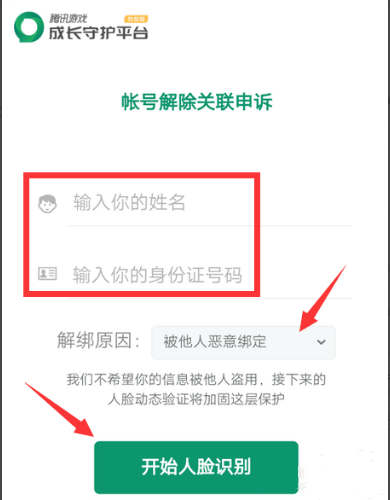 五、输入自己姓名和身份证号码,点开解绑原因后面的下拉框,选择被他人恶意绑定。然后点击开始人脸识别,完成人脸识别后就解绑成功了。