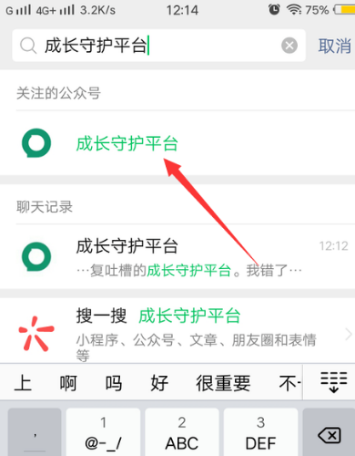 一、打开手机微信,公众号搜索成长守护平台,然后点击进入公众号。