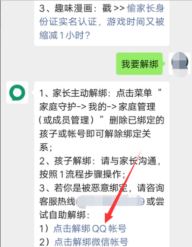 三、在成长守护平台回复的消息中,点击解绑QQ账号。
