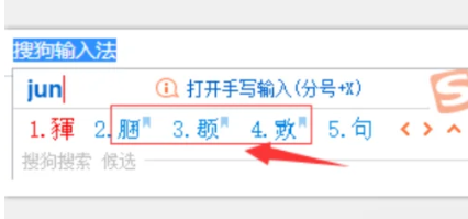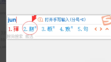 4、接下来需要在键盘上输入jun并找到这个字,如图所示。
