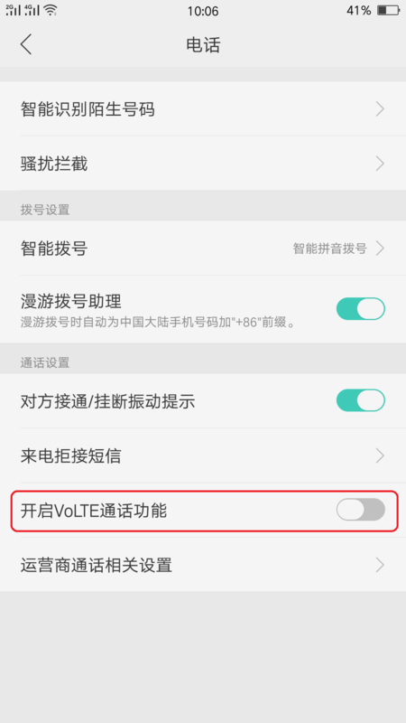 3、进入电话页面之后在“通话设置”栏下找到“开启Volte通话功能”选项,点击右侧的按钮将其打开即可。