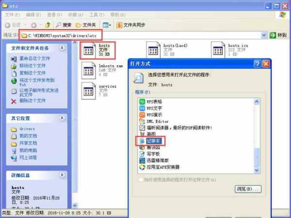 1、我的是XP系统,在这个目录之下,找到hosts后,右击选择打开或者直接双击,选择用记事本打开~