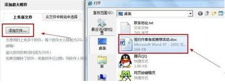 5、在“添加超大附件”窗口的“上传新文件”选项下单击“添加文件”按钮,选择自己要上传的文件位置,单击“打开”。