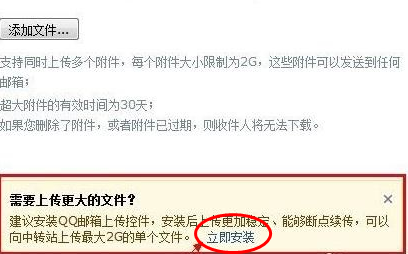 3、打开“添加超大附件”窗口,在“上传新文件”选项下“立即安装”按钮来安装QQ邮箱上传控件。