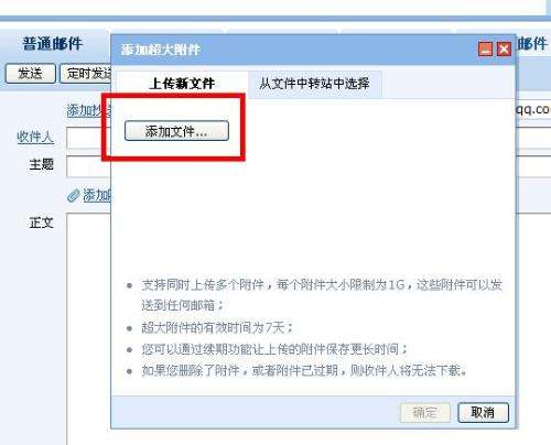 5、在“添加超大附件”窗口的“上传新文件”选项下单击“添加文件”按钮,浏览到要上传的文件位置,选中后单击“打开”按钮。