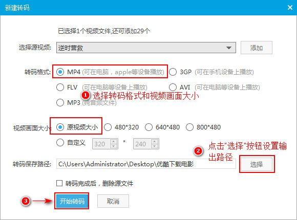 4.把视频拖动进来松开鼠标之后,会弹出如下图所示界面。此时我们先选择转码格式,一般都会转成常用的MP4格式,这就根据实际需求进行选择。视频画面大小就保持原视频大小就好。然后在‘转码保存路径’处点击“选择”按钮,在此设置视频转换输出目录,设置完后点击“开始转码”。