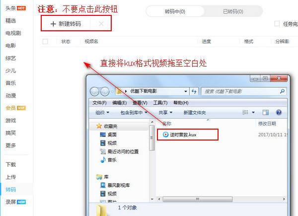 3.然后直接将要转换的1080p的kux格式视频文件拖进转码界面。注意1080p的kux格式视频不能通过点击“新建转码”添加进来,所以直接用鼠标将视频文件拖动进转码界面空白处就行,操作如下图所示。
