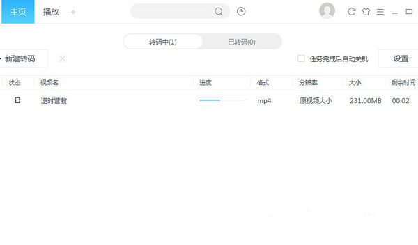 5.下图是视频正在转码的界面,会有进度条显示,另外还会显示转码格式为刚刚设置的MP4,当然小编最关注的是最右边的剩余时间,小编将一个多小时长的kux格式电影视频进行转换,没想到在一两分钟就转换好了,转换效率还是蛮高的嘛!不过这个转换速度也跟电脑本身有关系的哈。