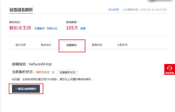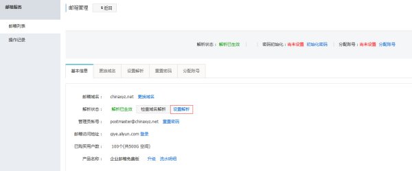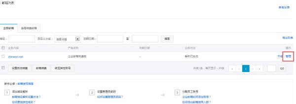 2.在邮箱管理列表中点击要设置解析的邮箱域名右边的【管理】,进入详细页后点击【设置解析】—【一键添加邮箱解析】。