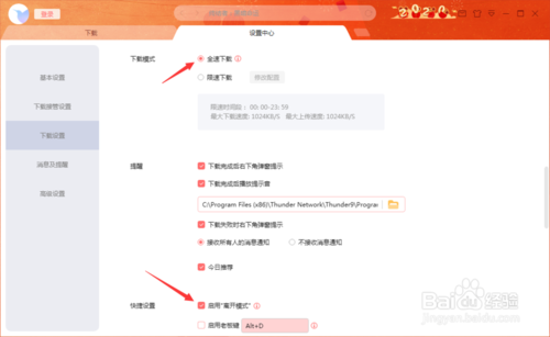 6、再启用下载模式为”全速下载“模式;快捷设置为启动离线模式,至此软件最大下载速度便基本设置完毕。