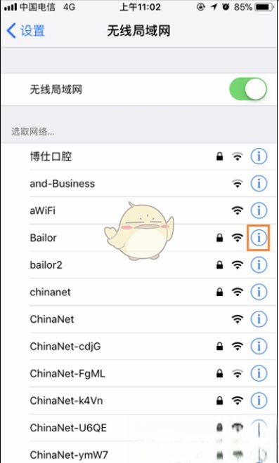 4、点击该无线局域网信号右边的“i”。