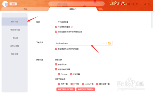 3、首先选择基本设置功能区,在此区域设置好下载文件的存放目录,以便后期的统一管理。