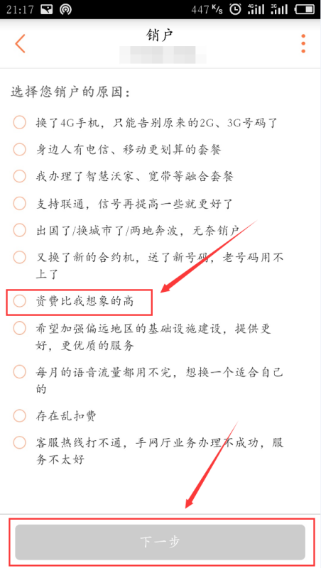 4、选择注销原因,然后点击下一步即可完成中国联通手机号码销户。