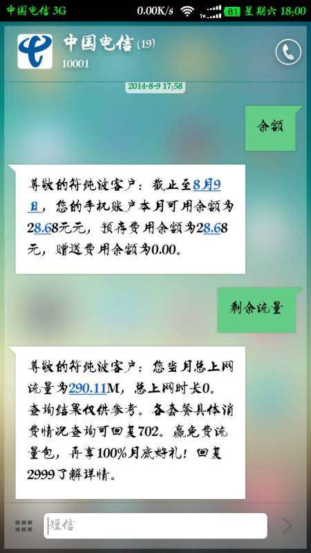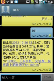 中国电信用短信查话费的方法:发送短信到10001,发送“101”查询实时话费,发送“102”查询余额。