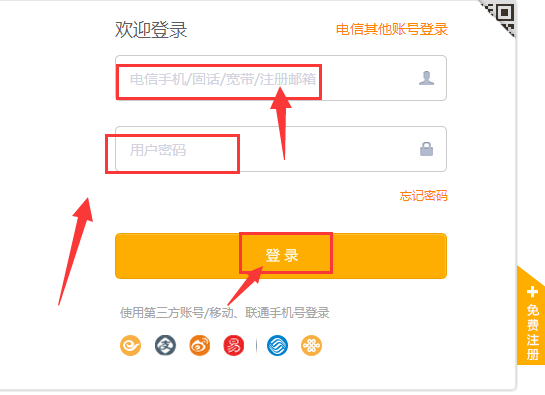 2.在账户登录页面输入手机号码和服务密码,点击“登录”按钮;