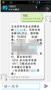 2、使用电信手机发送“102”到10001,即可收到余额信息。