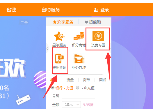 3、之后在主页右侧一栏中找到:费用查询,点击即可查询话费