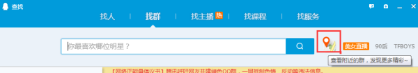 你好,打开QQ添加好友窗口,点击找群,在输入搜索框后面有个坐标样式的图像,点进去就可以看到很多附近的QQ群,满意请采纳哟,谢谢