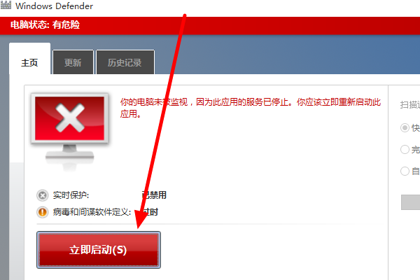 5、在打开的windows defender软件页面中,点击“立即启动”;