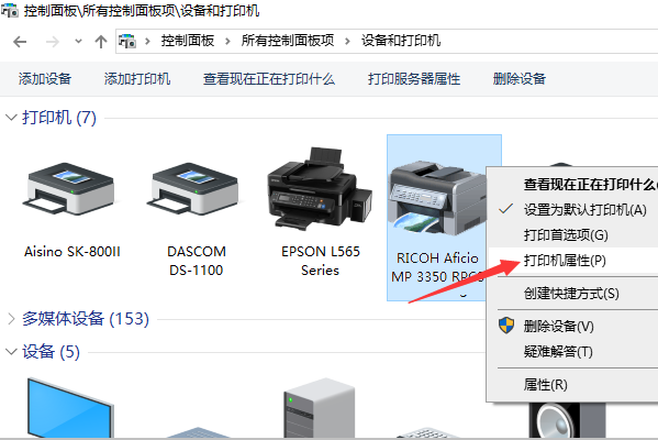2、在打开的打印机设备列表界面,选中该打印机点击右键,选择打印机属性进入。