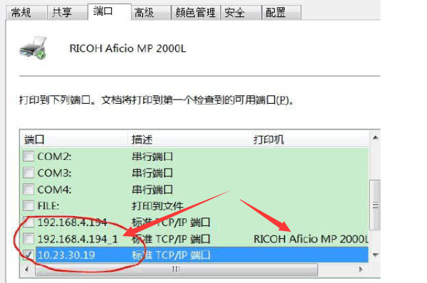 4、此时在出现的页面下方就可以看到该款打印机端口中标记的对应的IP地址。