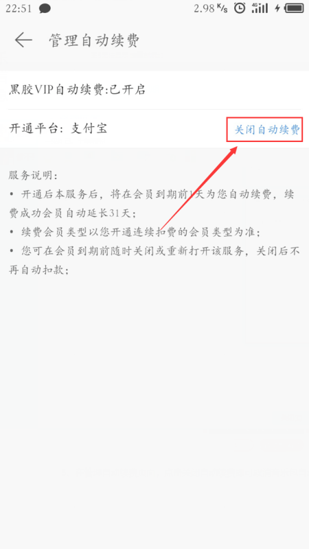 ④当来到自动扣费界面,在这里就可以取消自动扣费了,选择需要的操作就行