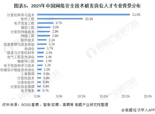 网络安全领域需要的人才专业性较强,但目前我国高等教育网络安全相关的专业领域较为分散。根据BOSS直聘研究数据显示,截至2021年第一季度,我国网络安全相关专业高校毕业生从事计算机/互联网技术研发工作的平均比例为59%,但在这59%的人群中仅有10%的专业对口人才直接进入到网络安全领域工作,因此,目前我国网络安全领域人才缺口较大。未来,随着我国对网络安全问题的重视,我国或将加大对网络安全人才的培养。