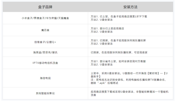 关于电视,投影仪,机顶盒,U盘等安装乐播投屏的说明介绍:
