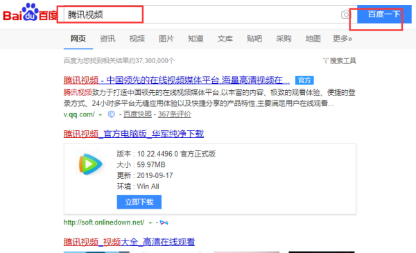 1、打开一个浏览器,在百度中输入“腾讯视频”,单击“百度一下”。