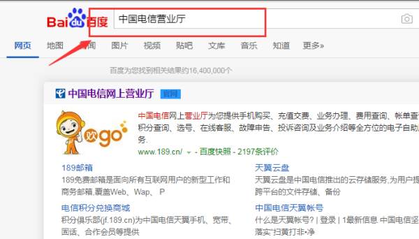 1、打开百度,搜索中国电信营业厅,并点击打开官网。