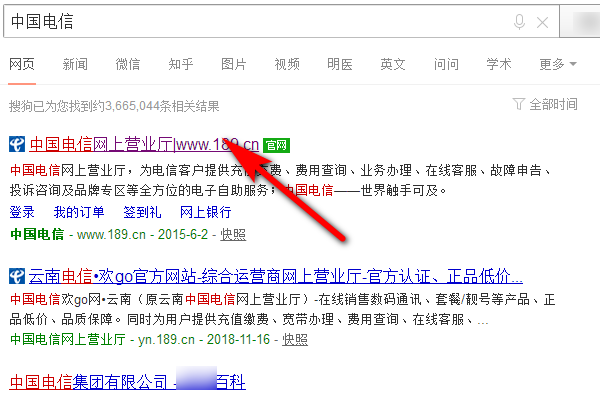 1、首先在浏览器里面输入中国电信,点击它的官网进入。