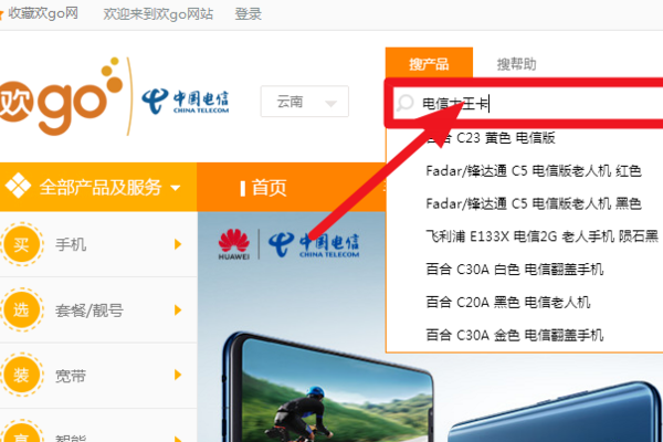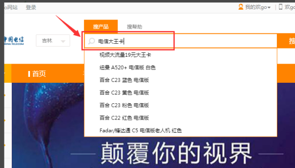 2、进入官网之后,在搜索框里面输入电信大王卡。