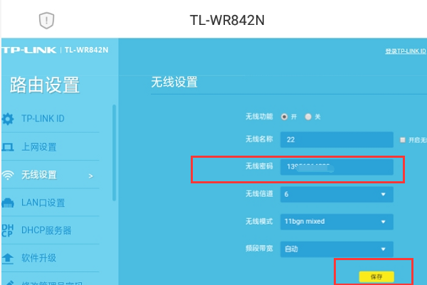 6、在出现的无线设置界面中输入需要的新的无线密码并点击保存按钮即可完成WIFI密码的修改。