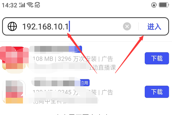 2、在出现的浏览器地址栏中输入该192.168.10.1,点击进入。