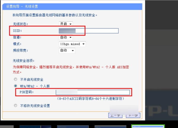 4、接着在此页面中找到SSID选项,并在这个选项里面输入密码,同样在PSK一栏中输入一个密码,输入完毕之后,然后点击下一步。