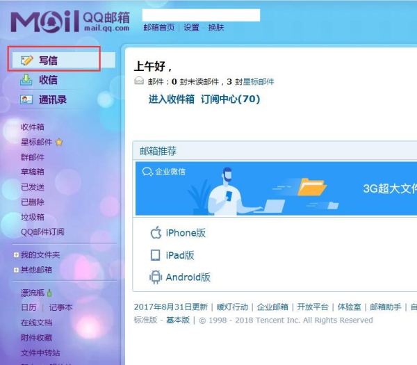 2、打开QQ邮箱主页面后,点击左上角“写信”菜单;