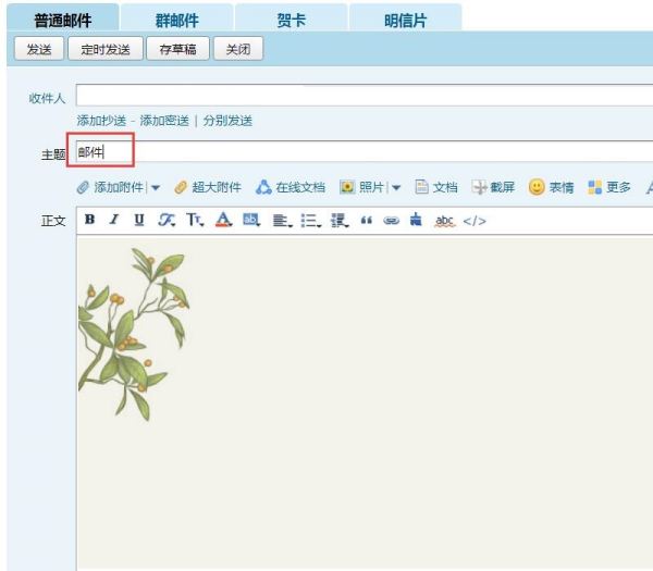3、输入收件人地址,编辑邮件主题和邮件正文;