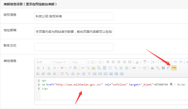 这种网站后台要怎么在网站底部增加一个备案号并做个超链接到工信部网址呢?