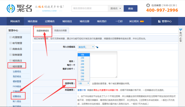 您可以一年一续费,也可以续费多年,比如聚名网,想要一次性续费多年,您可以在域名管理--续费域名--批量续费域名,输入或导入域名,选择续费年限,最高可以选择续费9年