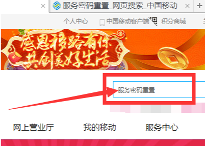 2、接下来,登录中国移动个人账户,在页面顶部的搜索框中输入“服务密码重置”,如下图所示。
