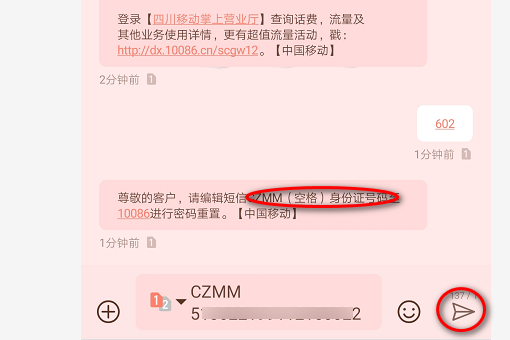 7、收到回复信息之后,回复内容CZMM+身份证号码,点击发送;