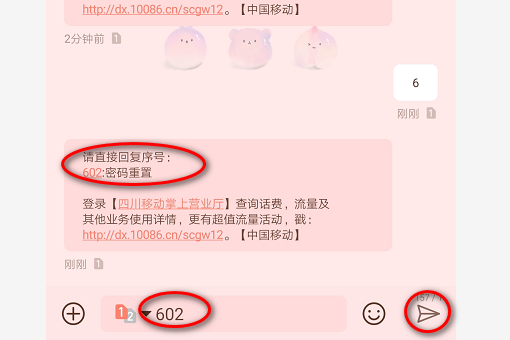 6、收到回复信息之后,回复数字602,点击发送;