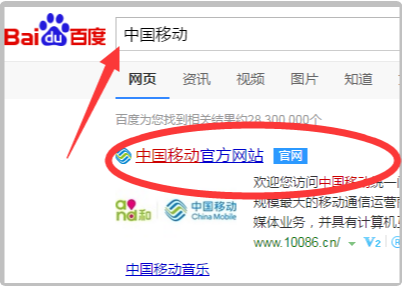 1、首先,在百度搜索中输入“中国移动”,在搜索结果中点击进入官网,如下图所示。
