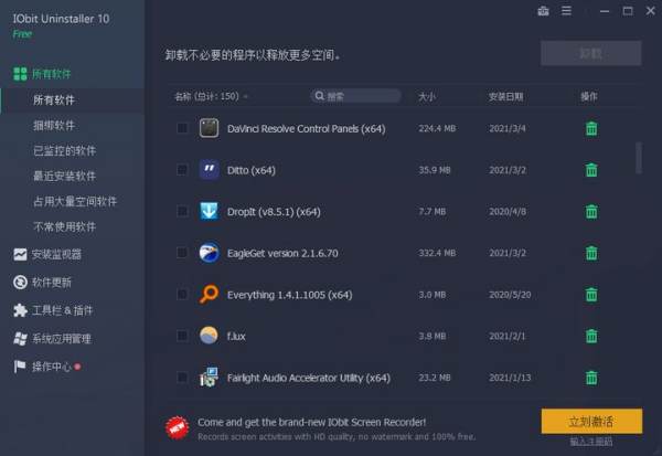 ?pwd=xg6e 提取码: xg6eIObit Uninstaller v10是一款非常优秀的卸载清除软件,它可以帮助用户轻松卸载您计算机上安装的程序、捆绑软件、Windows应用程序和插件等,从而使你的计算机运行非常流畅,并能够自动针对一些残余文件和内容进行彻底的清除,避免软件清理不干净而导致造成的风险。同时该软件还会帮你一键快速清理掉无用的垃圾文件,从而释放大量的内存空间,使得电脑的性能大大提高,并且软件支持批量卸载。