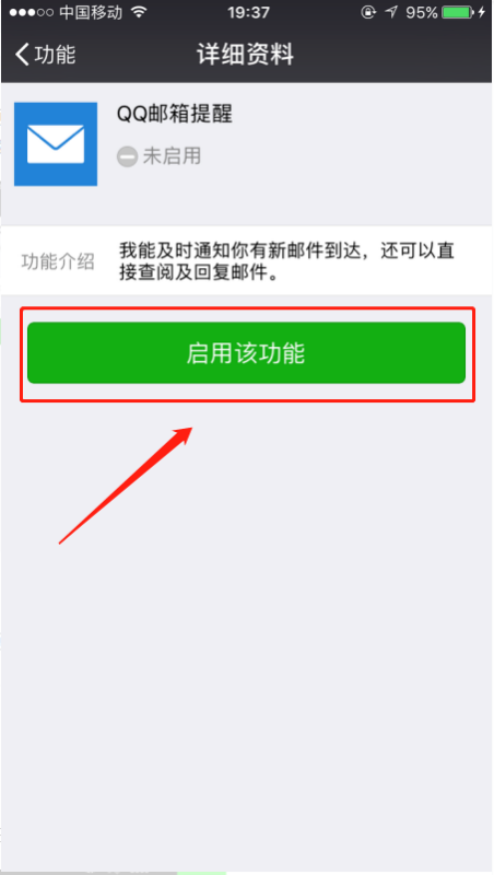 5、点击“QQ邮箱提醒”进入此功能的设置页面,会看到下面的“启用此功能”按钮,使您的QQ邮箱绑定到您的微信上,会收到微信上的新邮件提醒。
