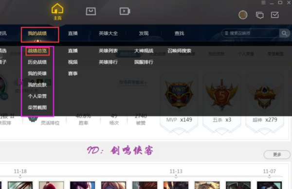 在英雄联盟专区的主菜单里,找到【我的战绩】。鼠标悬停在【我的战绩】,则可以看到下属菜